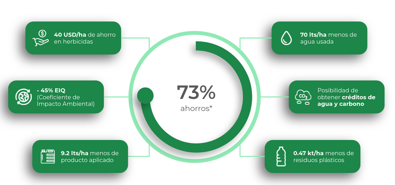 Al aplicar herbicida de forma puntual sobre cada maleza en vez de pulverizar todo el lote indiscriminadamente, se logran grandes ahorros de costos, pues el lote solo está cubierto por malezas en un 30% en promedio [*Ref: REM Aapresid]. El consumo de agua y de productos disminuye notablemente, logrando una reducción en el índice de impacto ambiental.